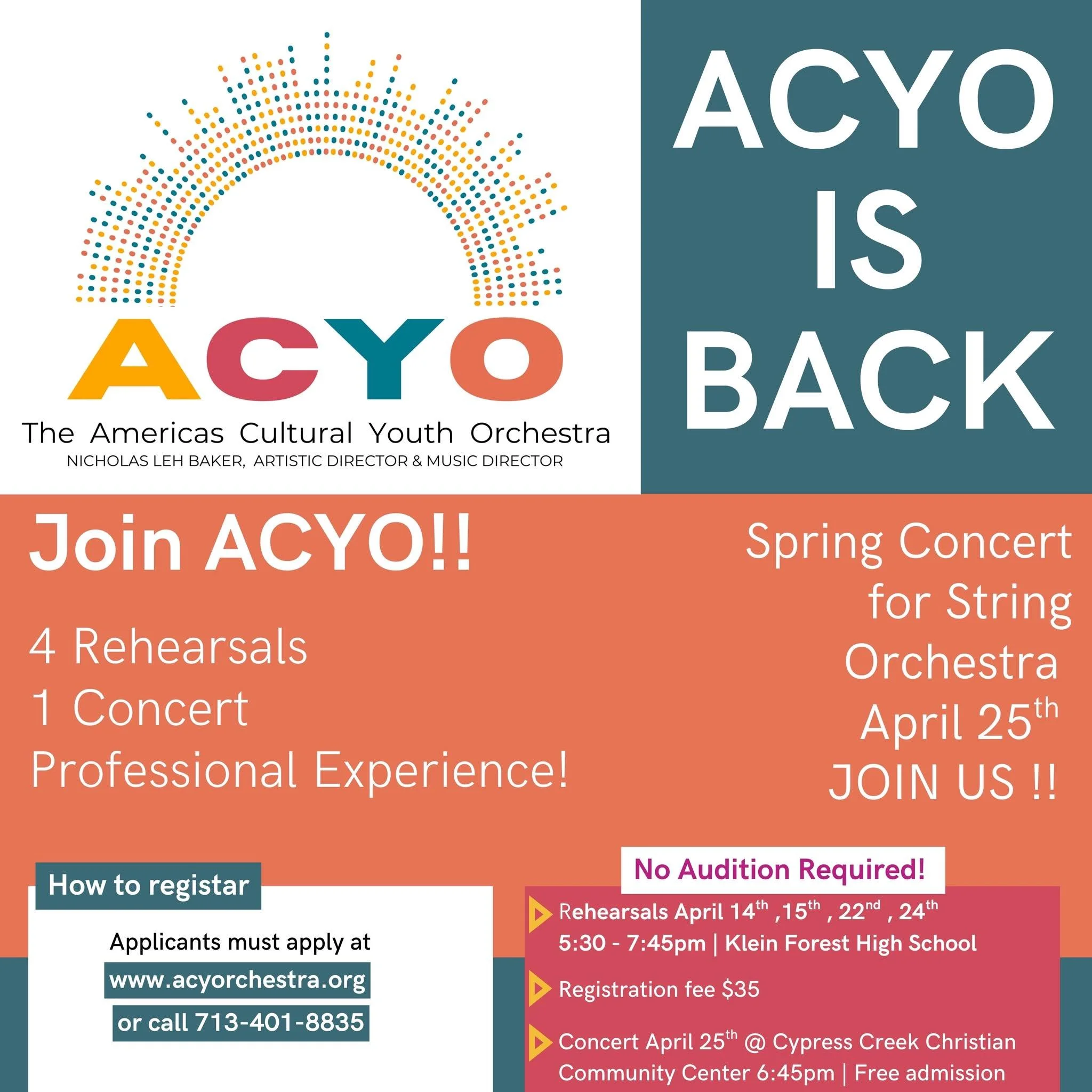 View fullsize I am delighted to announce the return of the Americas Cultural Youth Orchestra, offering a professional experience for talented young string players from the Houston area. With only four rehearsals leading to  a captivating concert, participants will
